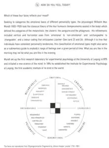 His refinements included vertical and horizontal axes from 'emotional' to 'non-emotional'. and 'unchangeable' to 'changeable'‚ and a colour coding that anticipates Luscher (See card 23 and 24). Although it is true that individuals have consistent personality tendencies‚ this classification of emotional types might also serve as a rudimentary guide to anybody's range of feelings over a given period of time.